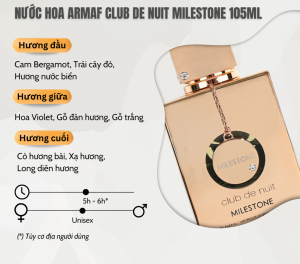 Khi lưu lại trên da, Milestone dần trở nên ấm áp hơn nhờ sự xuất hiện của gỗ và xạ hương, tạo thành tổng thể hài hòa, thư thái và tinh tế. Đây là mùi hương vừa sang trọng vừa dễ dùng, thích hợp cho đi làm, đi chơi hoặc du lịch biển.